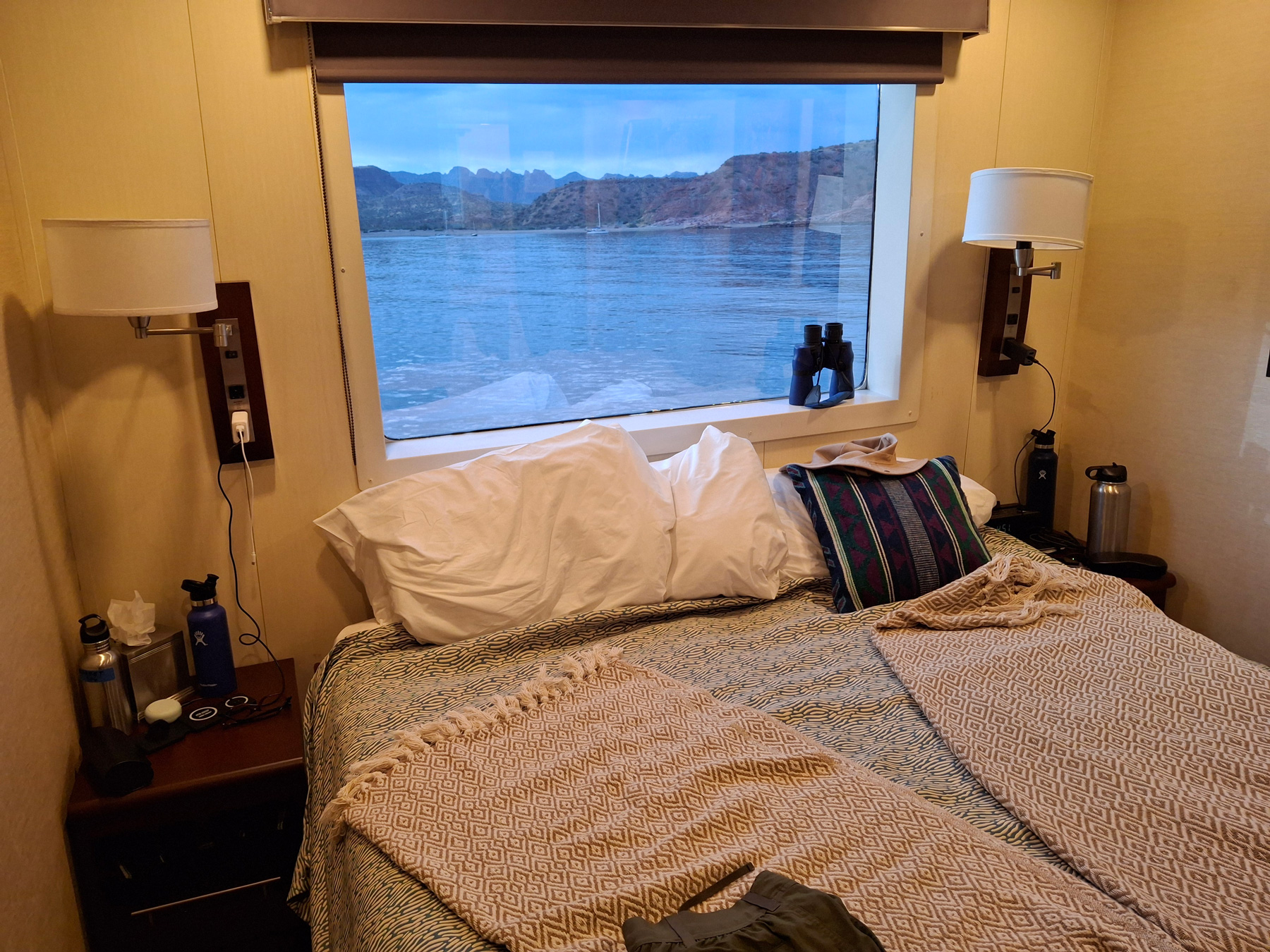 Our cabin on the 200 deck is smaller than the upgraded quarters we had on the Wilderness Explorer, but not by much. A queen-sized bed, with two bedside tables, plenty of maneuvering room, and a window that looked directly out with no walkway in front. The entry door opened to the interior corridor, though one still had to go outside to get to the lounge upstairs on the 300 deck. But considering the warmer climate of Baja, spending time outside on the boat came to be more welcome than it might be in Alaska.