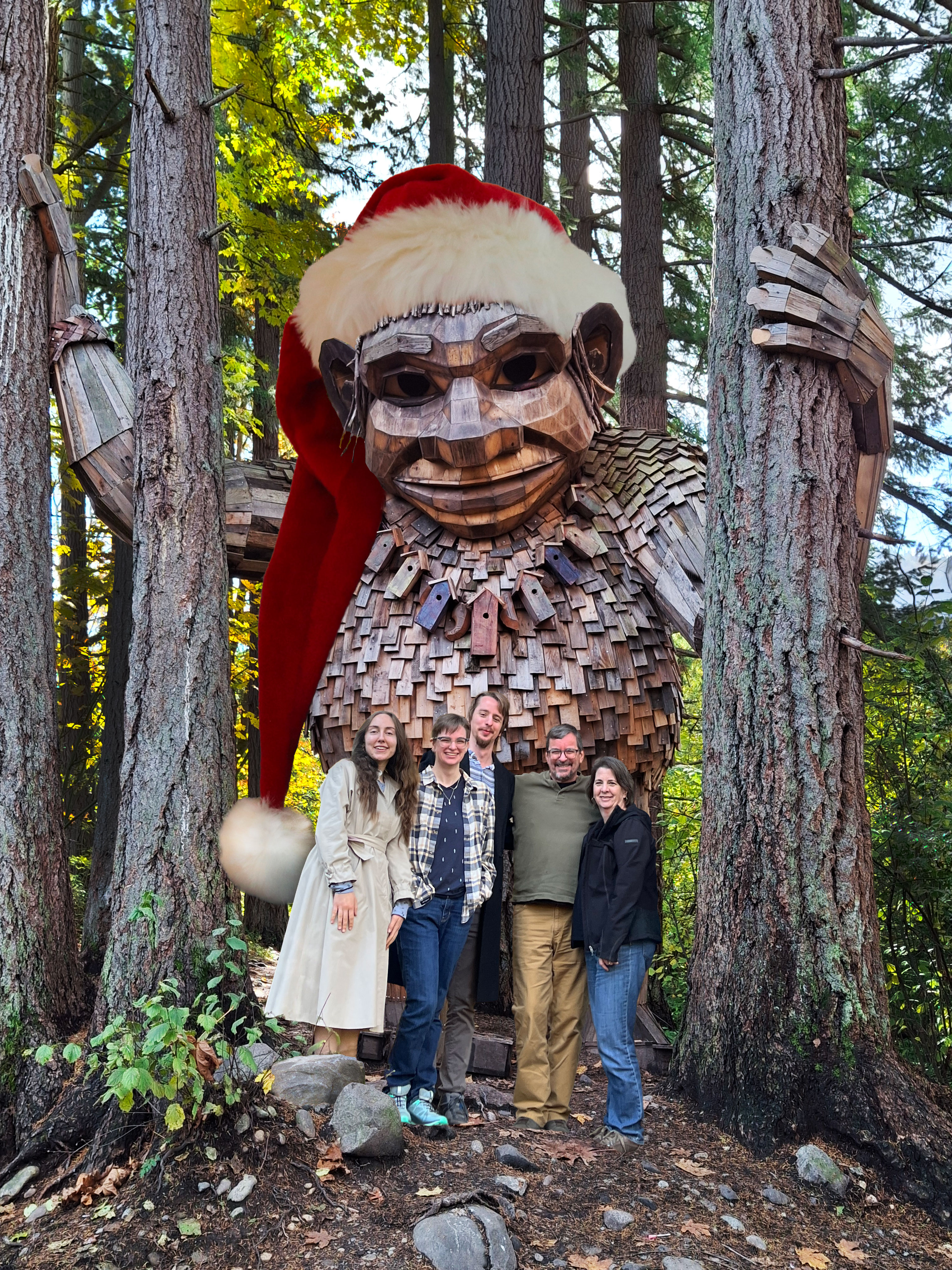 Toward the end of the year, we visited several of Thomas Dambo installations for the Northwest Trolls: Way of Bird King project. This years card was captured during the visit to Jakob Two Trees in Seattle, and includes Adam's girlfriend Nicole.